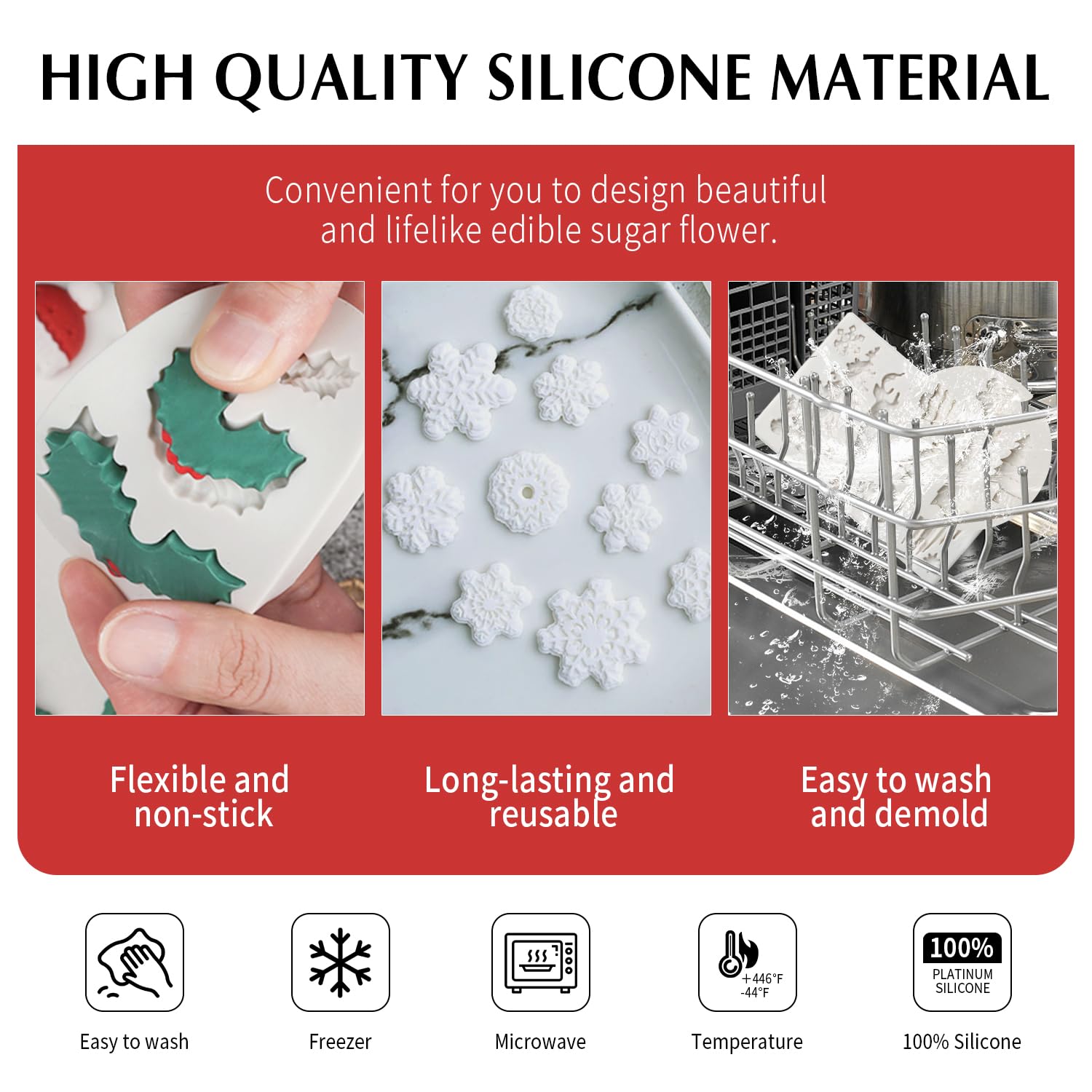 Christmas Fondant Mold Set of 5 Pieces- 3D Snowflake, Christmas Tree, Reindeer, Holly Leaf, Cupcake Topper for Cake Decorating Tools