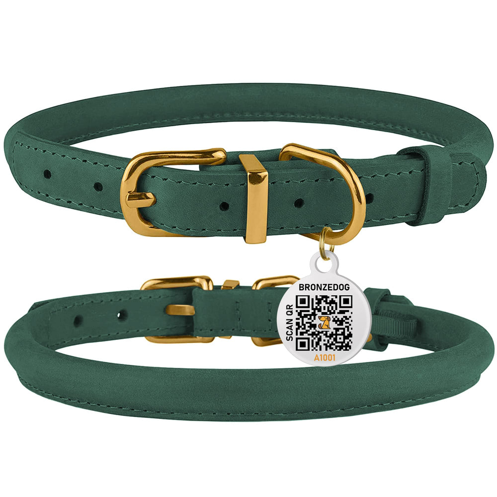 BRONZEDOG Rolled Leather Dog Collar with QR ID Tag Adjustable Soft Round Collars for Small Medium Large Dogs Puppy Cat (14" - 16" Neck Size, Emerald Green)