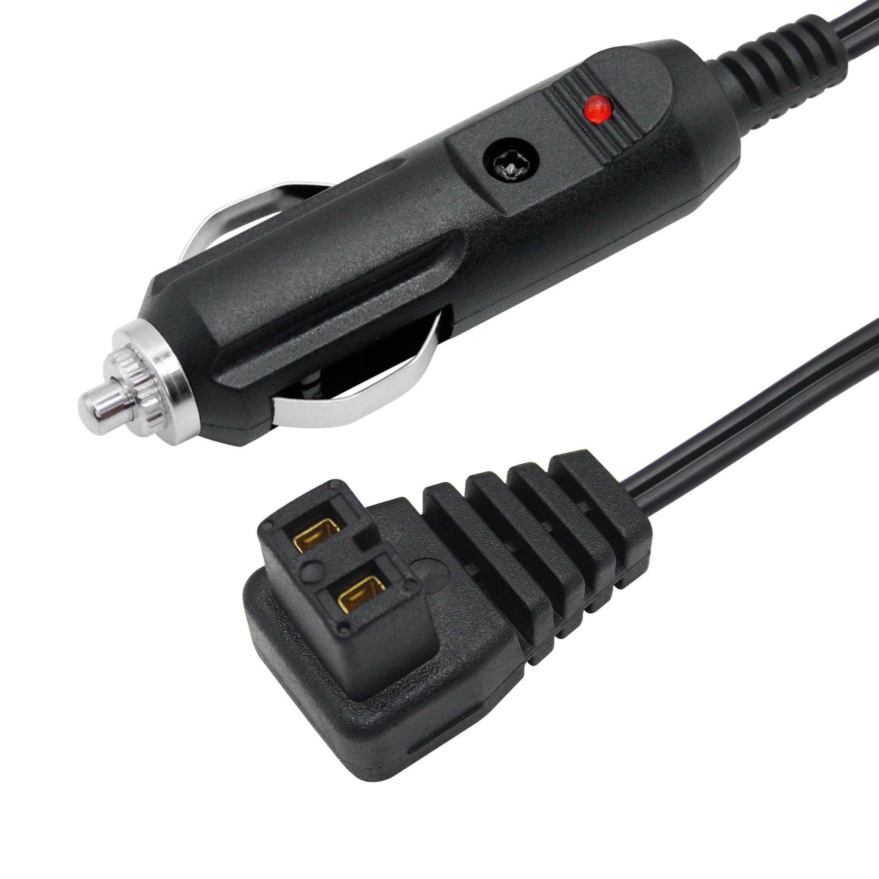 - 12V car cooler plug power cord cable, 1 end of cigarette lighter male plug and the other end of right angle 2 pin square jack female plug, connection car car cooler portable refrigerator. (Note: This car cooler power plug is not used for all car cooler portable refrigerator, please confirm the car cooler plug and size you are using)