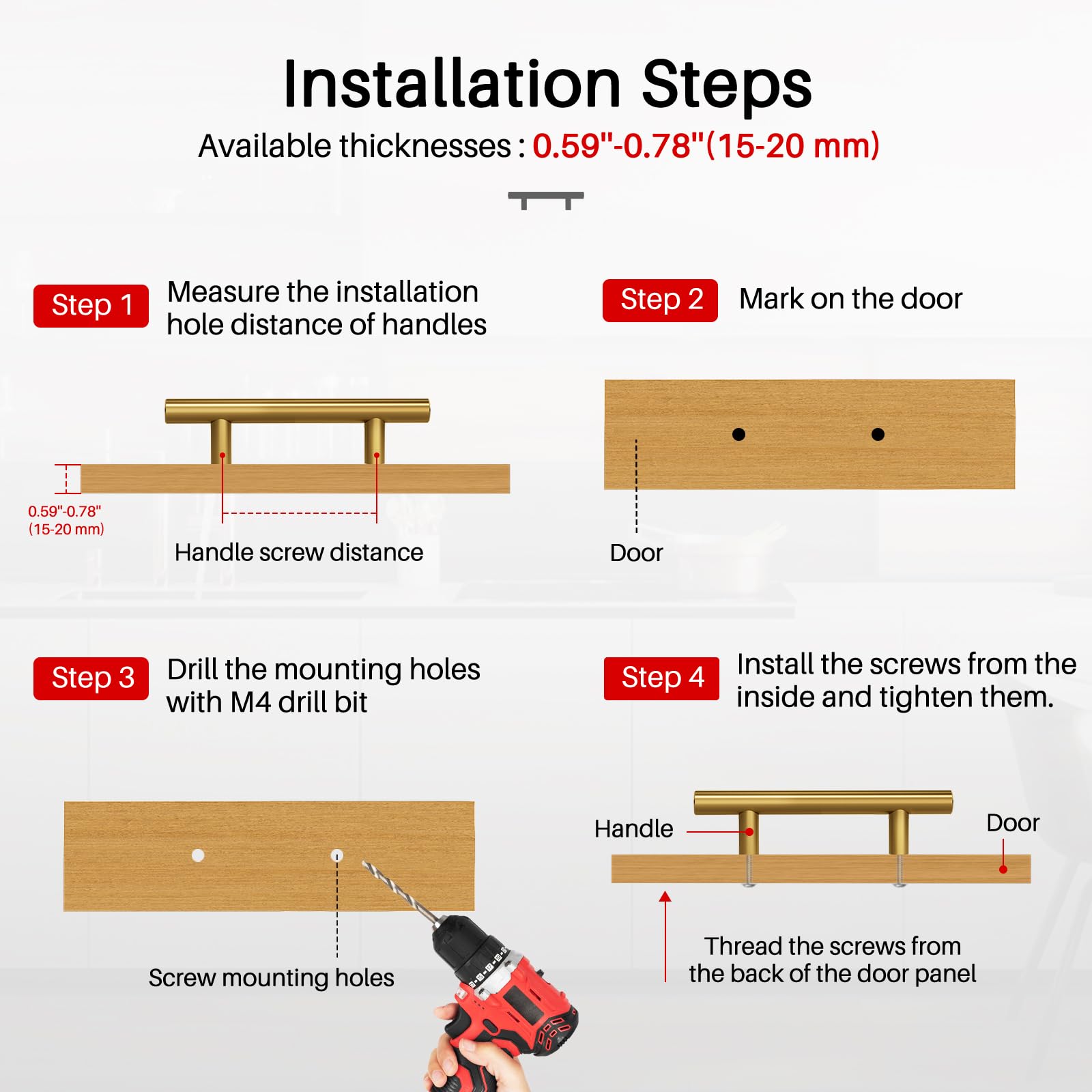 - [ Brushed Brass Handles ]: brushed brass cabinet handles are available for furniture wooden board-Thickness: 0.59-0.78inch (15-20 mm). Features a rounded design for a comfortable grip and easy installation. Stylish, modern, refresh your home look