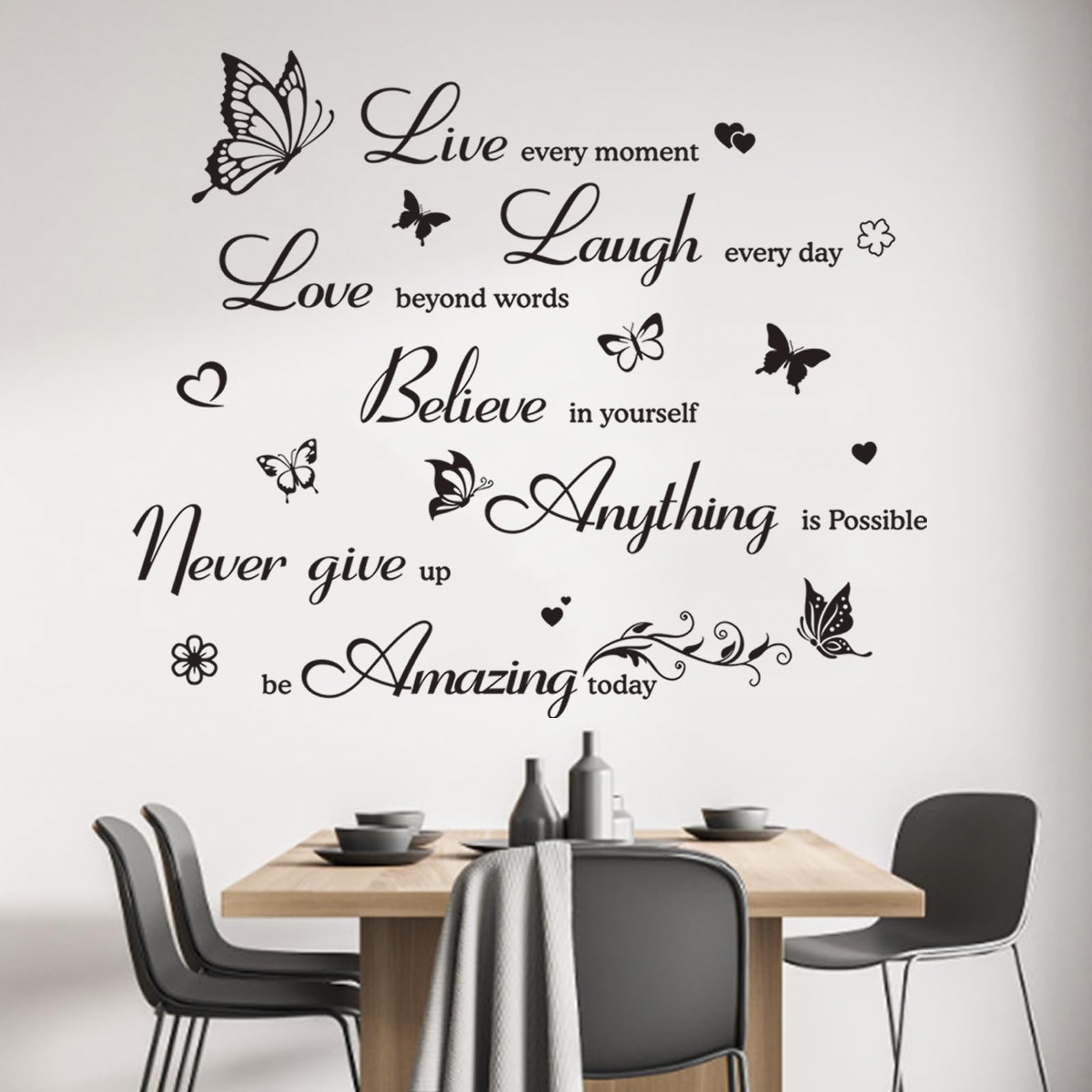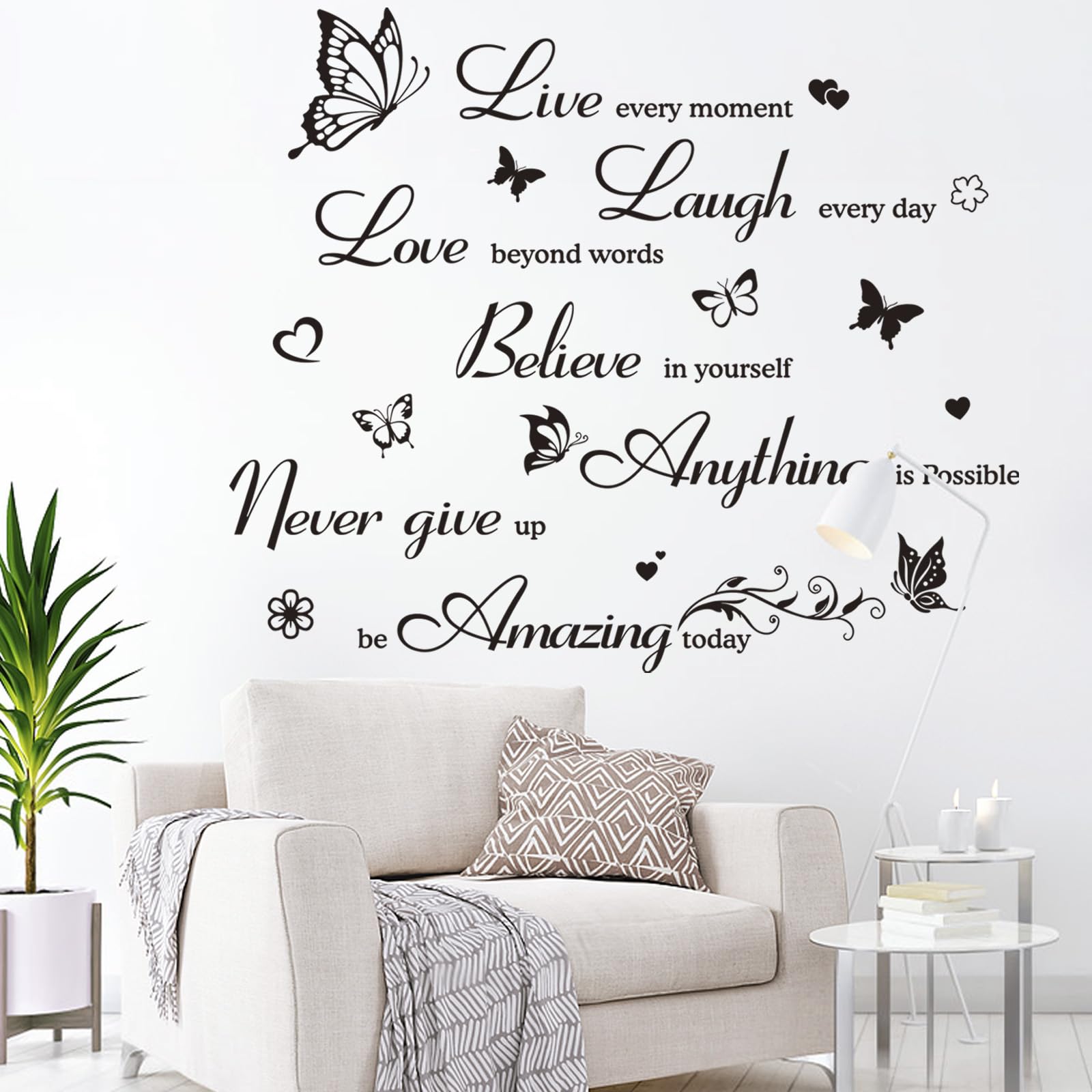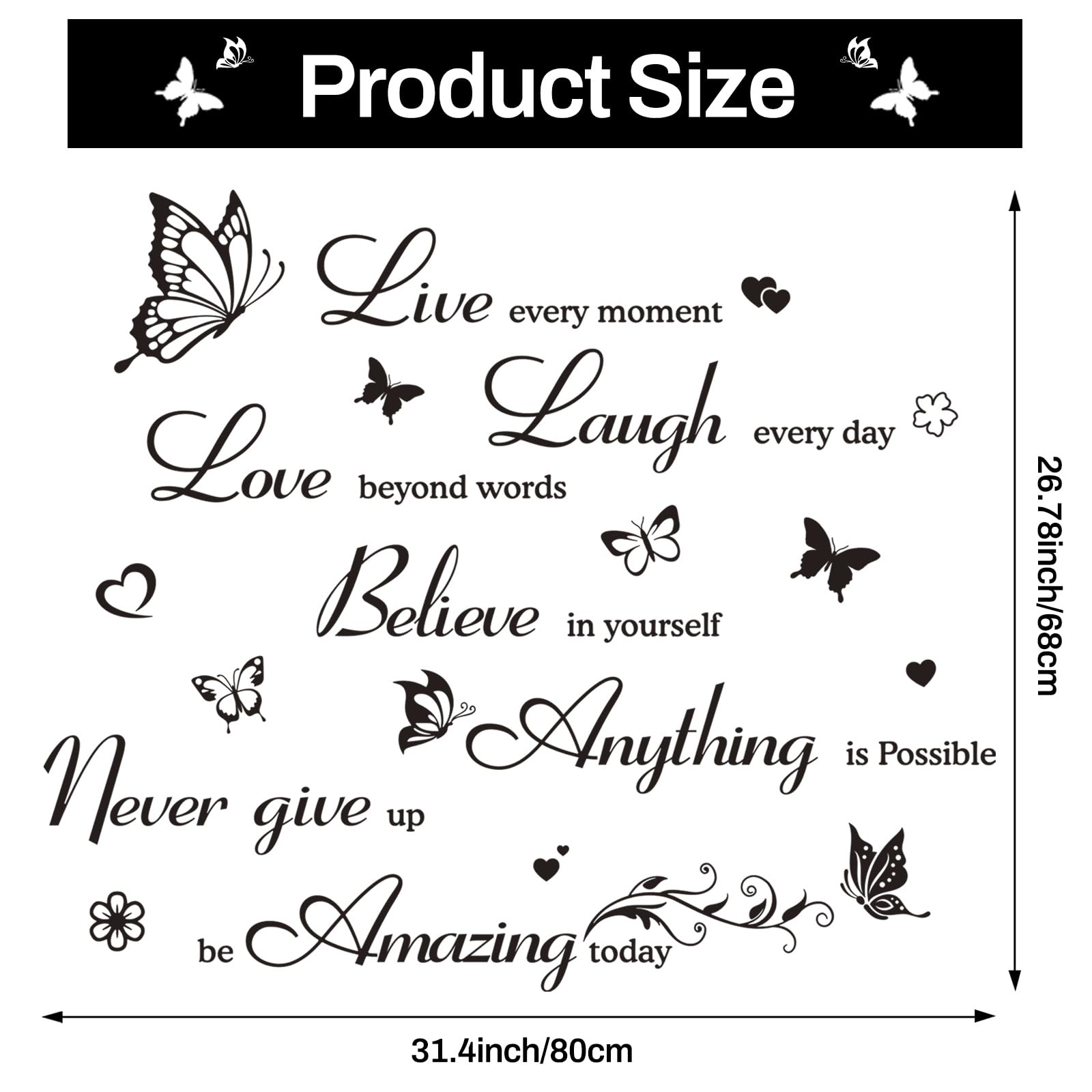 Details: With a black color scheme and smooth lettering surrounded by flowers, butterflies and hearts, our wall decal is practical and wall art decoration. This inspirational wall sticker will not only brighten up your house for your guests, but also bring positive energy into your life, making you more inspired and motivated.
