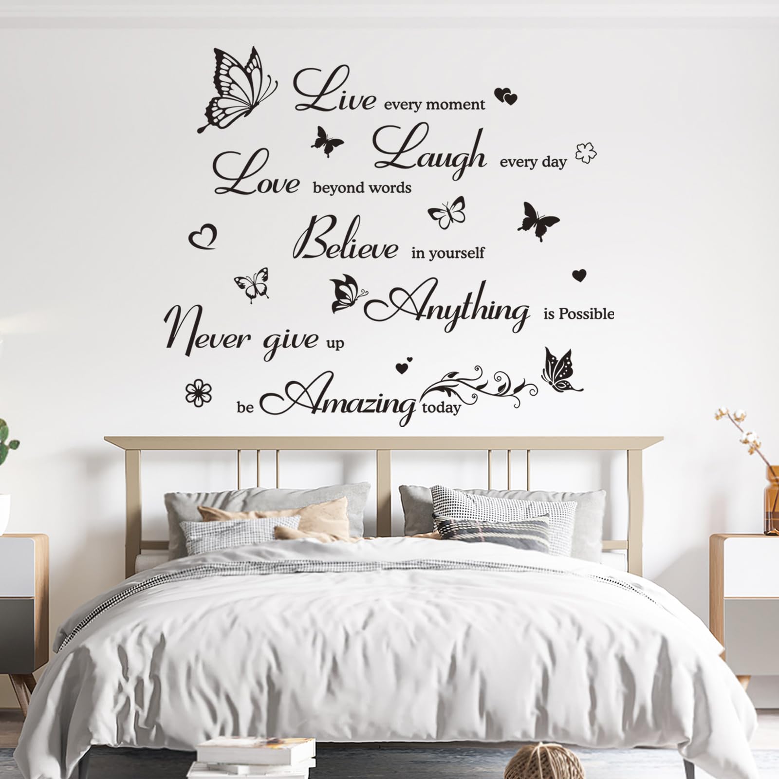 - 【Quotes Wall Stickers】: Our wall decals combine inspirational phrases of life guidelines, beautiful flower vines, small butterflies and love hearts skillfully to achieve the perfect decorative effect. Inspirational wall art decals can bring positive energy to your life, keep your home motivated and brighten up your space.