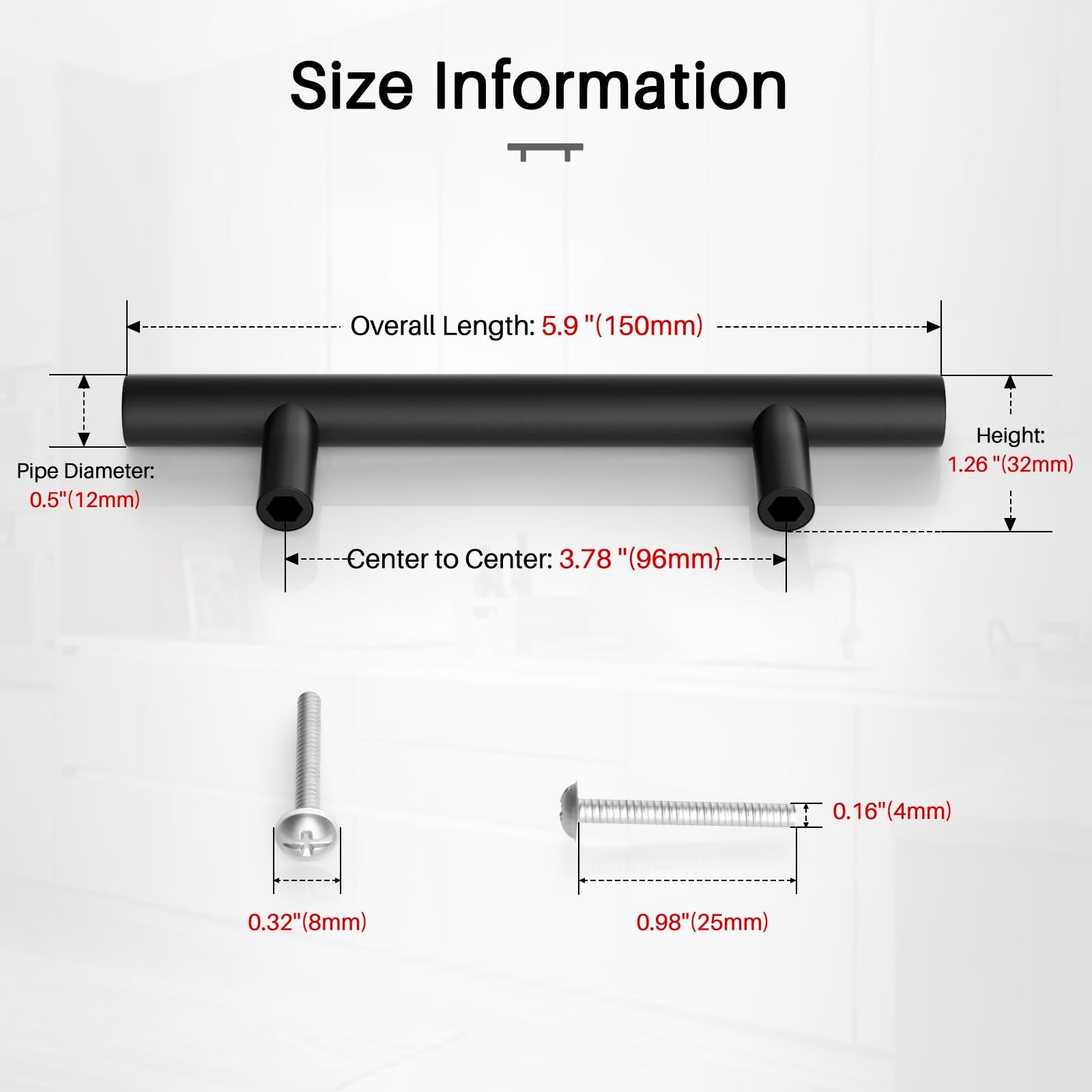 • [ Perfect Fit & Includes Screws ]: Hole center(C-C): 3-3/4 inch (96mm); Overall Length: 6 inch (150mm); Height: 1-1/4 inch (32mm); Pipe Diameter: 1/2 inch (12mm). Each pull handle comes with 2 M4 screws * 25mm (0.98 inch)