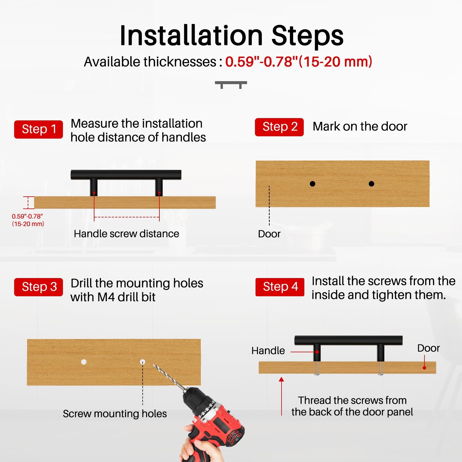 • [ Modern Matte Black Design ]: matte black cabinet handles are available for furniture wooden board-Thickness: 0.59-0.78inch (15-20 mm). Features a rounded design for a comfortable grip and easy installation. Stylish, modern, refresh your home look
